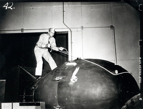 my father standing on a casing for the implosion bomb, so called Fat Man. I don’t think this is the actual bomb that was dropped, but they had to have casings at Los Alamos to make sure that the device, or weapon, AKA “the Gadget” would